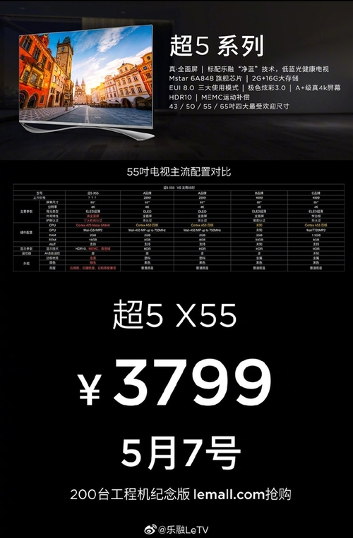 价格方面,超级电视第五代55寸售价3799元,43寸售价2199元。工程机纪念版5月7日200台限量发售,其他产品6月上旬陆续发售。