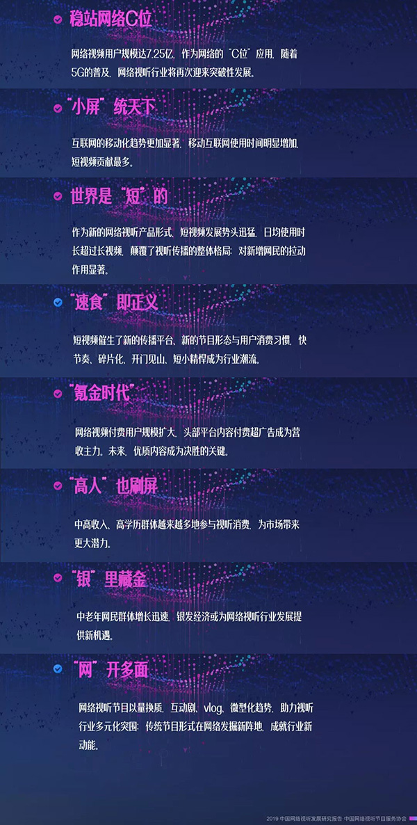 此外, 《报告》基于调研、数据、访谈,客观描述了中国网络视听发展环境、现状及趋势,提出八大核心发现,并预测整体视频内容行业规模仍将保持平稳增长,随着5G技术的发展,网络视听行业还将迎来历史性、突破性的发展机遇。