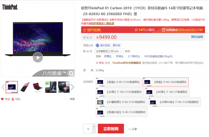至于价格,ThinkPad X1 Carbon 2019 LTE版,i5-8265U+8+512GB预约价10299元,i7-8565U+8+512GB预约价12999元。