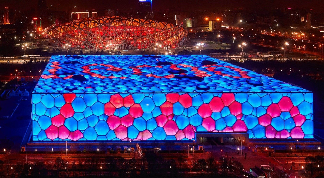 直播期间的一大看点就是“点亮”水立方,发布全新的Lecoo品牌。当晚19时30分许,随着水立方顶层蓝“3、2、1”倒计时结束,Lecoo LOGO出现蓝色的水泡ETFE墙面上,在夜色的映衬下,绚烂夺目、美轮美奂。