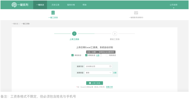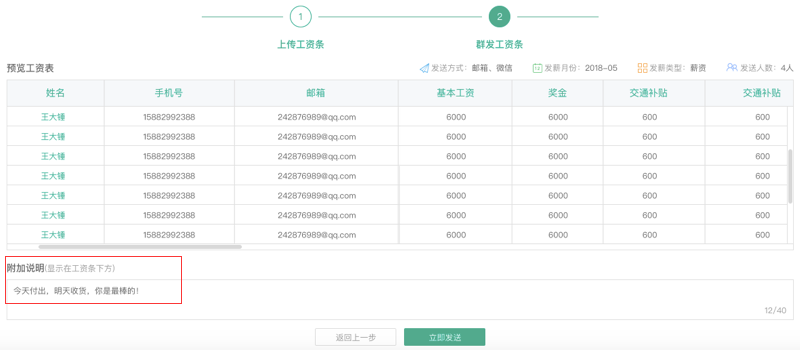 选择发送方式、发薪月份与发薪类型,点击上传工资条