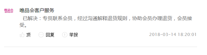 3月14日,唯品会客户服务在聚投诉上留言,已解决:专员联系会员,经过沟通解释退货规则,协助会员办理退货,会员接受。