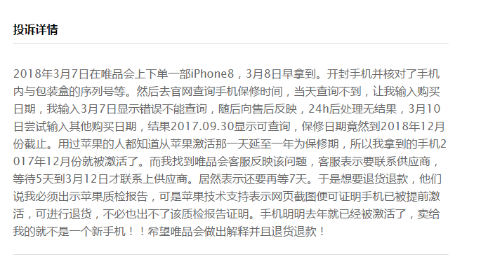 投诉详情显示,2018年3月7日,杨女士在唯品会上下单一部iPhone8,3月8日早拿到。但杨女士查询保修日期发现,保修日期到2018年12月份截止。杨女士认为自己拿到的手机早在2017年12月份就被激活了。随后,杨女士将问题反映给唯品会客服,客服表示要联系供应商。等待5天,联系上供应商后,客服表示还要再等7天。杨女士想要退款退货,客服却告诉杨女士必须出示苹果质检报告。杨女士认为,手机明明去年就已经被激活了,唯品会卖给自己的就不是一个新手机!杨女士希望唯品会做出解释并且退货退款!