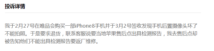 投诉详情显示,谭女士于2月27号在唯品会购买一部iPhone8手机, 并于3月2号签收发现手机后置摄像头坏了不能拍照。