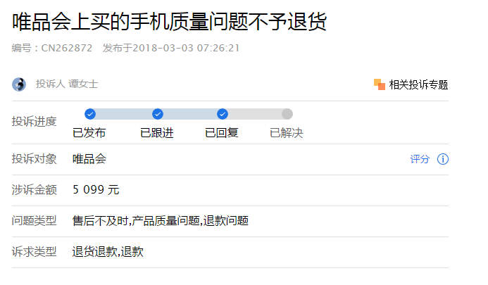 而3月3日,一位谭女士投诉唯品会称,在唯品会上买的手机有质量问题却不予退货。