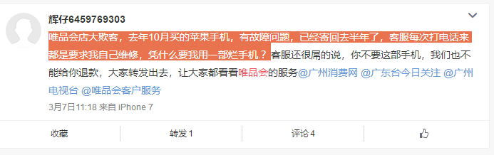 3月7日,微博用户@辉仔6459769303也因为买手机而投诉了唯品会。他说:唯品会店大欺客,去年10月买的苹果手机,有故障问题,已经寄回去半年了,客服每次打电话来都是要求我自己维修,凭什么要我用一部烂手机.?客服还很屌的说,你不要这部手机,我们也不能给你退款,大家转发出去,让大家都看看唯品会的服务。