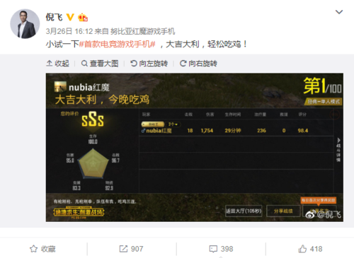 如果此前就比较关注红魔游戏手机的朋友,可能已经发现过不少的蛛丝马迹了,比如nubia智能手机总经理倪飞就曾发过一条庆祝自己顺利吃鸡的微博,其游戏名称和微博小尾巴写的正是努比亚红魔游戏手机。