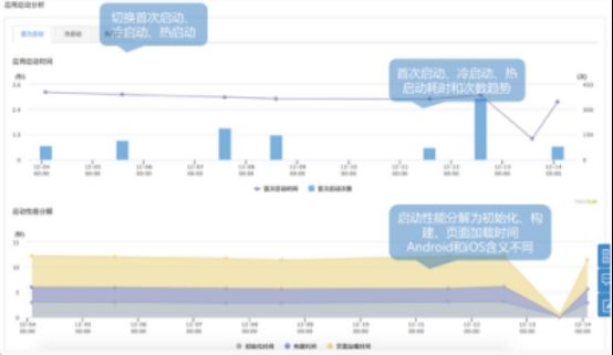 进入应用启动时间和性能分解图表中,选定App、版本和时间范围,可分别查看:首次启动、冷启动、热启动的启动时间和次数,及首次启动和冷启动过程的性能分解。