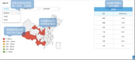 在地图分析图表中,可查看:首次启动、冷启动、热启动,在不同地域、接入方式、运营商组合维度下的启动时间分布。(接入方式、运营商组合可多选)