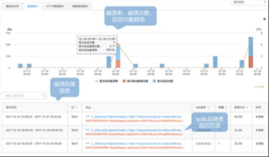 进入崩溃统计页面可查看首次启动、冷启动、热启动过程的崩溃次数、启动次数及崩溃率的趋势。(点击Bug列表可进入崩溃详情页)