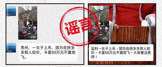 拼多多方面表示,这条1年前的视频,被别有用心者配以“拼多多砍价”等文字,捏造出湖北、贵州等地女子因砍价被骗轻生的谣言,引发了消费者恐慌。