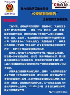 4月5日,河南平顶山警方对发布“公安部紧急通告:红包、砍价、拼多多皆为骗局”谣言的网民陈某,依法做出行政拘留三日的处罚。此外,放任他人传播谣言的微信群主王某,也因违反《互联网群组信息服务管理规定》,被警方批评教育。