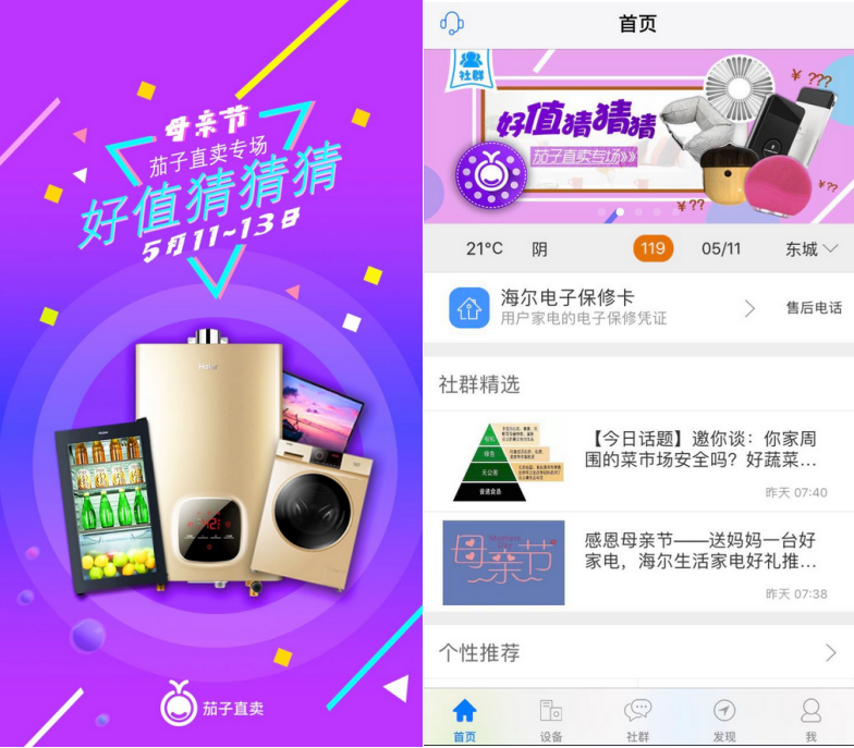 5月11日至13日,海尔优家用户竞猜指定商品的价格,即有机会赢取茄子直卖提供的海尔专属优惠,恰逢2018年母亲节,海尔优家APP的“好值猜猜猜”活动特定五款商品,该五款产品皆为茄子直卖商城中的爆款商品。