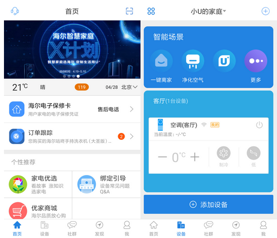 凭借着冰箱、洗衣机等产品的强大技术积累,以及完善的供应链和售后保障体系,积累了极佳的用户口碑,在近年来物联网技术的不断发展过程中,海尔也顺应潮流推出了海尔优家(U+)智能物联网平台,通过海尔优家APP即可实现智能控制电器、家电服务、兴趣社区和进入海尔商城等功能。