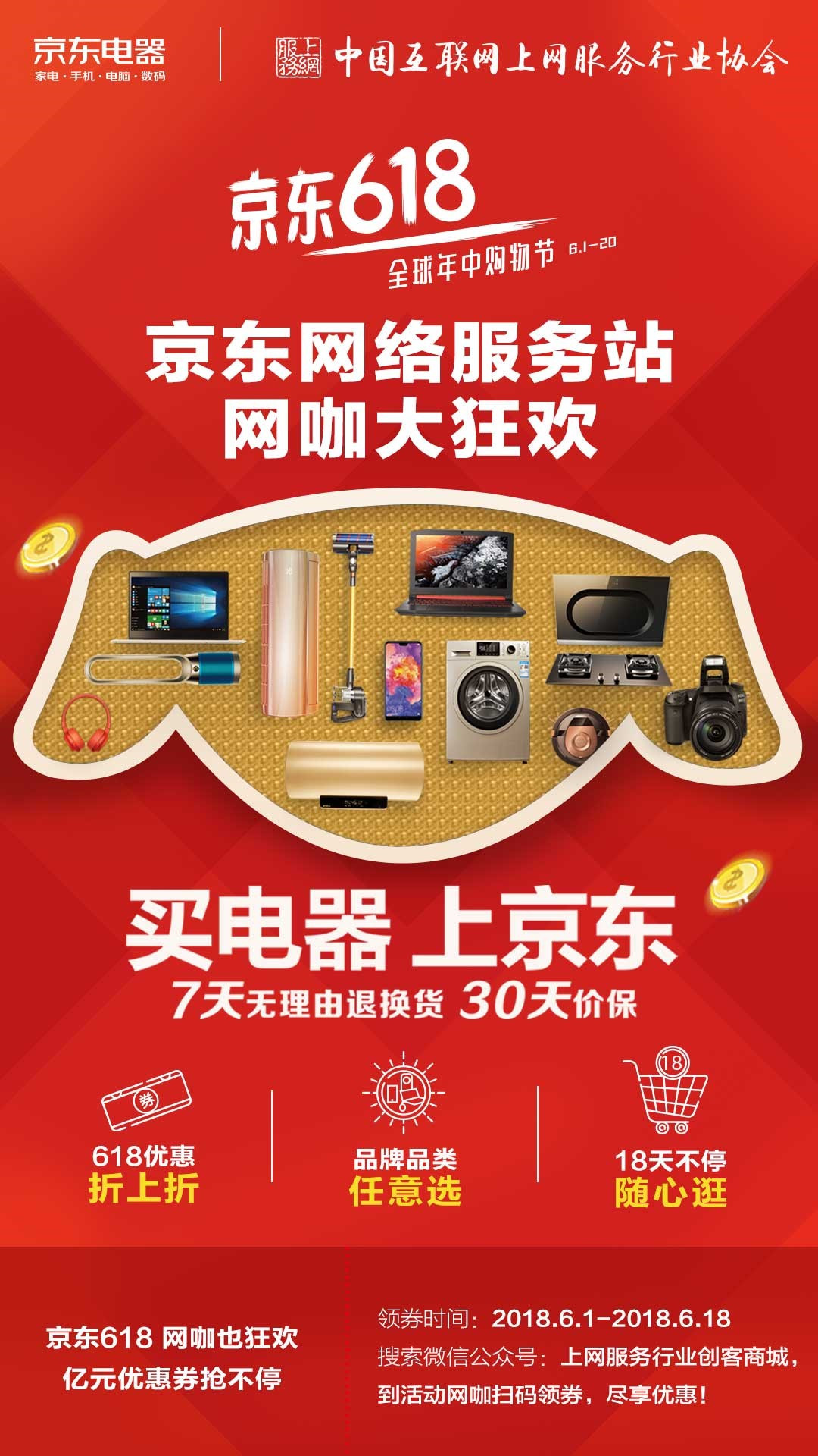 在网咖抢到的优惠券可以在618期间进行消费,不仅在京东电器7天无理由退换货,30天价保的基础上享受折上折,还能在超级秒杀日、超级品牌日、超级神券日等京东618大促日期间获得最大优惠,更有电脑、手机、数码、家电等多款电器类产品尽享专属优惠。