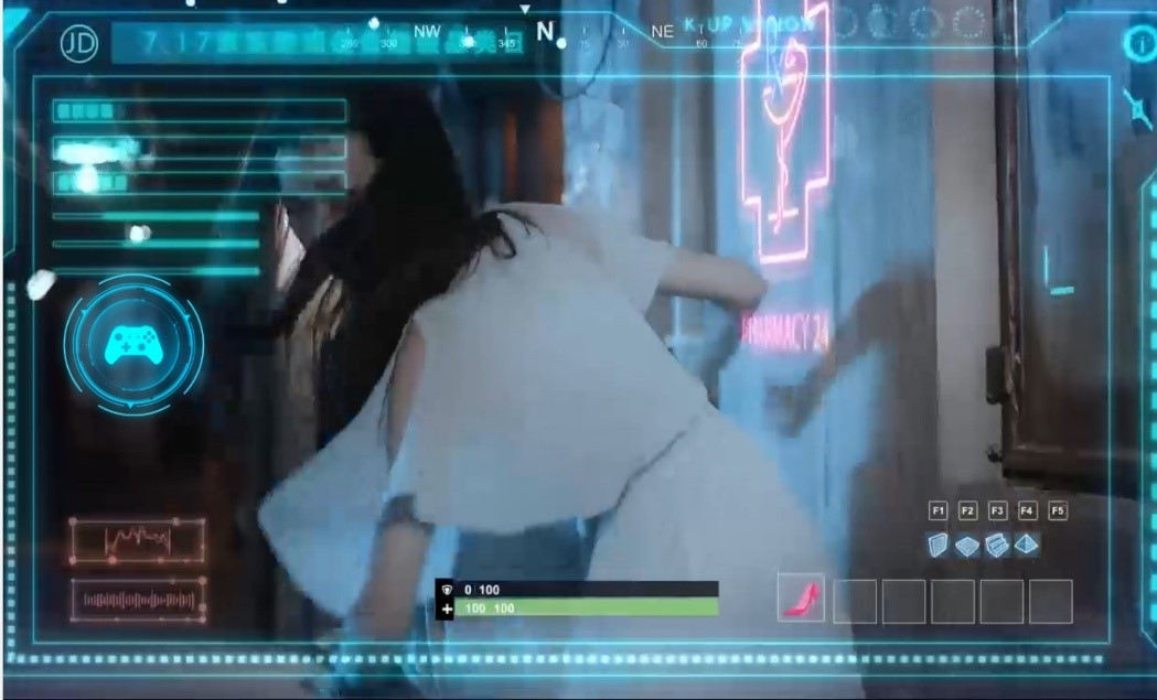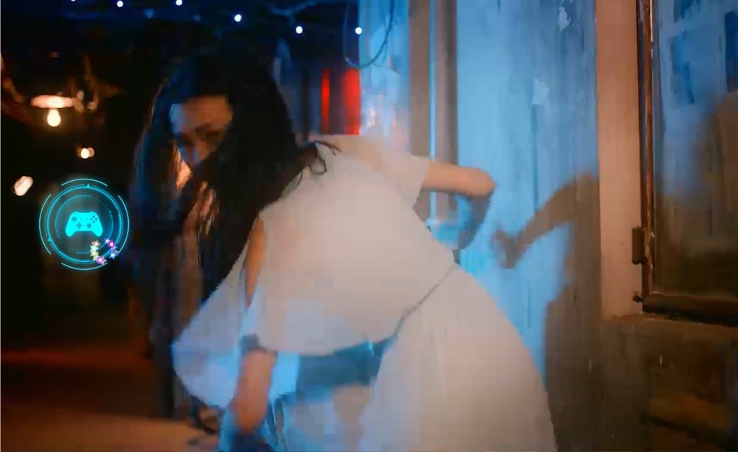 再比如另一个镜头里,女主回家路上,走在暗黑的小巷子里,发现有男性疑似尾随,在音乐的渲染下,瞬间给人一种紧张感。在这样极度危险的时刻,为了自保,她向对方扔高跟鞋,甚至捡起路边废弃的平底锅反击。这里平行的游戏画面是扔炸弹以及绝地求生里甩平底锅的情节。生活中战斗力爆棚,游戏中一样势不可挡。当然最后发现原来是一场误会,尾随者只是想归还她掉落的手机,大家皆大欢喜。