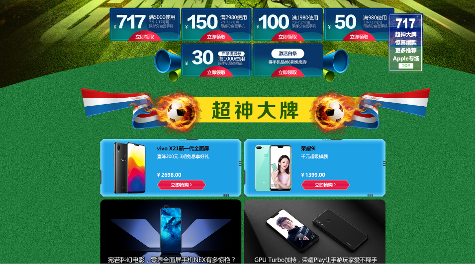 手机专场也在火爆热卖中!游戏手机抢717元神券,爆品直降心动价,三星note8最高立省1789元,白条12期免息。荣耀最高优惠400元!vivo X21最高直降300元。这是你离心爱神器最近的一次!别犹豫,喜欢就赶快行动,现在就加入“717京东游戏装备超级品类日”的狂欢现场吧!