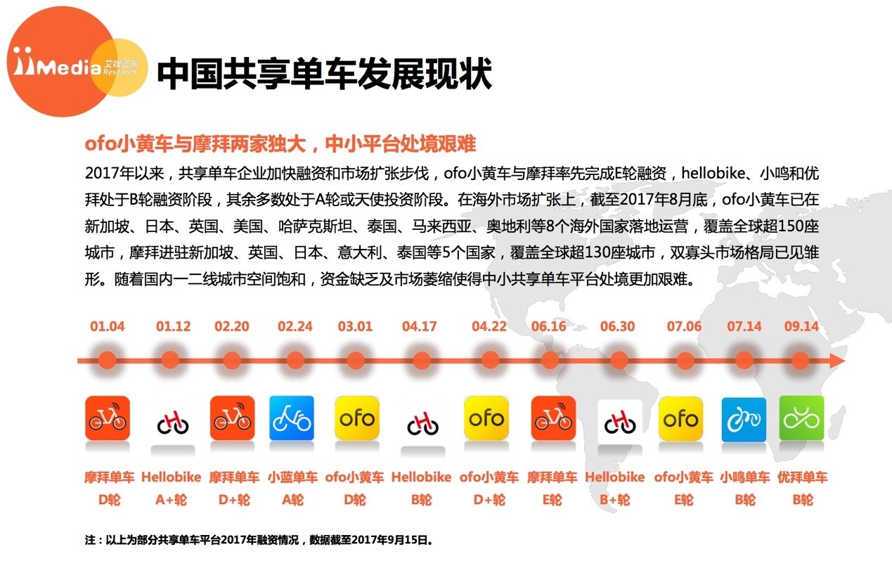 艾媒咨询的数据还就中国共享单车的发展现状进行了分析。分析称,2017年以来,共享单车企业加快了融资和市场扩张的步伐。以ofo、摩拜为首的共享单车平台也加速在国内和海外市场布局。