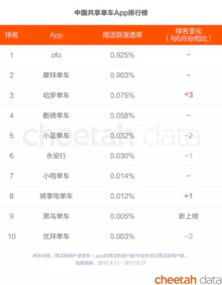 另据猎豹全球智库9月最新数据显示,ofo周活跃渗透率方面领先摩拜,这也意味着ofo将连续5个月高居共享单车行业第一位。