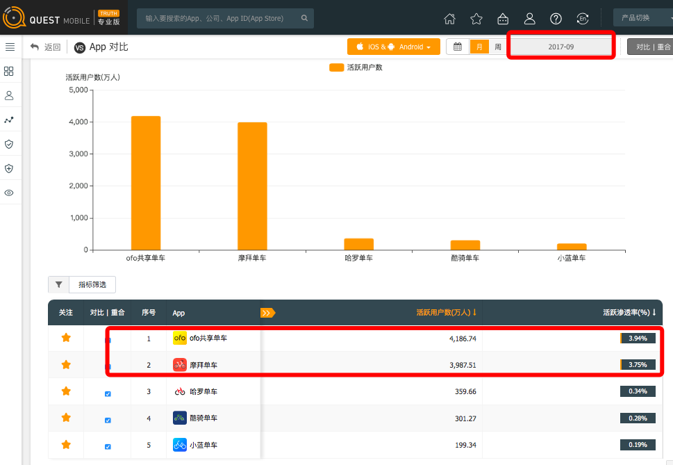 除去三家数据外,QuestMobile数据也显示,在中国App市场活跃渗透率方面,ofo9月活跃渗透率为3.94%,环比增长近16%,位居共享单车行业第一;摩拜活跃渗透率为3.75%,环比增长5%,位居行业第二。数据对比可知,ofo的活跃渗透率增速是摩拜的3倍之多。