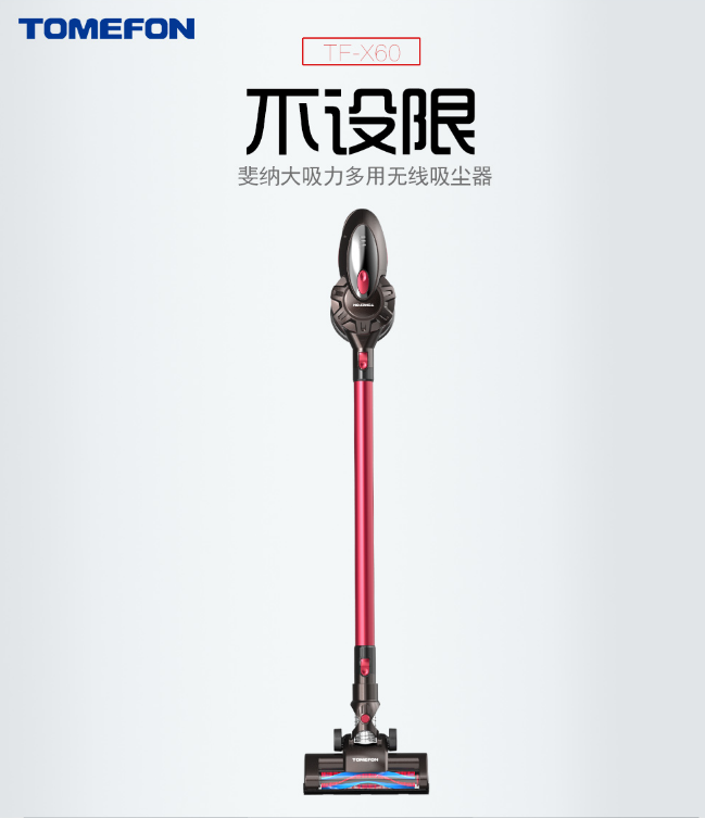 斐纳TOMEFON,国际驰名品牌,科技创新实力雄厚,1976年成立至今有40余年历史,高端的品质、优异的性能、以及多样化的功能让它在吸尘器领域连续八年占据榜首宝座。是德国的老品牌,性能在不断升级。最新推出的斐纳TF-X60上市后立刻被抢购一空,两档吸力可以随心切换, 将马达和电池等重要部件置于手柄下部,与前端的旋风过滤系统达到力学平衡,轻松提拉,久握不累。一键倒尘轻松不脏手操作方便,便捷!搭配不同吸嘴可轻松应对室内多变的环境。