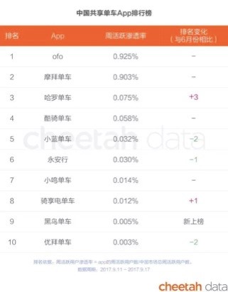 另据猎豹全球智库9月最新数据显示,ofo周活跃渗透率方面领先摩拜,这也意味着ofo将连续5个月高居共享单车行业第一位。