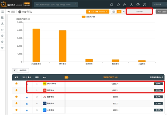 QuestMobile发布的9月数据中则显示,ofo最新的月活用户增至4186.74万,摩拜月活用户增至3987.51万。可见,ofo小黄车成为了共享单车行业当之无愧的“扛把子”。数据中还显示,ofo小黄车的市场活跃渗透率增速和活跃用户规模增速也均是市场第二名摩拜的3倍之多。所谓“既生瑜,何生亮?”ofo小黄车在业界强劲的发展势头,让竞争对手们闻风丧胆,完全无力与其相抗衡。
