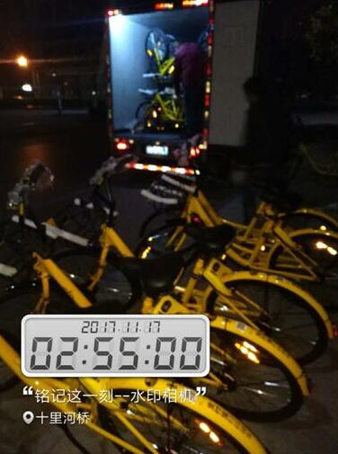网友爆料称,11月17日,凌晨2点55分,在夜色的掩护下,发现一辆运输了满满一车的箱货货车停在十里河桥区域,疑为ofo工作人员偷偷投放大量的新车,很多小黄车的座椅上还带着未拆的塑料袋。