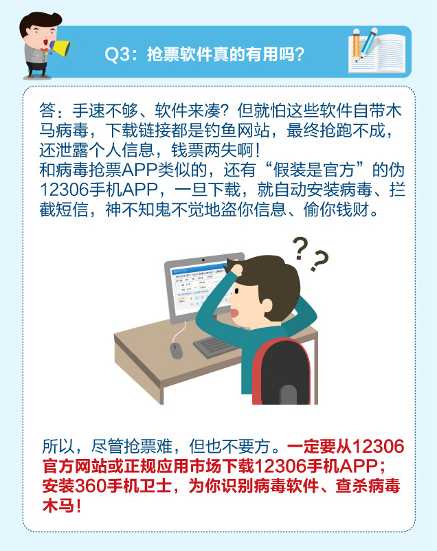 1月3日开始,一年一度的春运抢票大战又拉开了序幕。目前,中国铁总已在其官方微博发布了“2018年铁路春运购票日历”,火车票预售期为30天。此外,而从往年的情况来看,春运抢票同样也是电信诈骗的重灾区之一,许多用户在抢票中往往会不小心泄露个人信息,从而遭遇到诈骗,损失相当严重。因此,360手机卫士特献上春运抢票秘籍及防骗手册,盘点春运抢票的“超实用攻略”,助广大用户安全抢票早日回家。