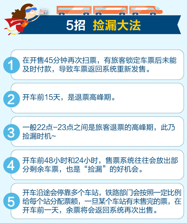 如果用户在购票时没有能立即买到需要的车票,也不必心慌。虽然春运票源紧张,但也存在着很多“捡漏”机会。这些捡漏机会大致分为两类,一类是抢别人的退票,一类是抢铁路部门系统放出的余票。如果抓住这些捡漏的好机会,用户能有效提高成功购票的几率。