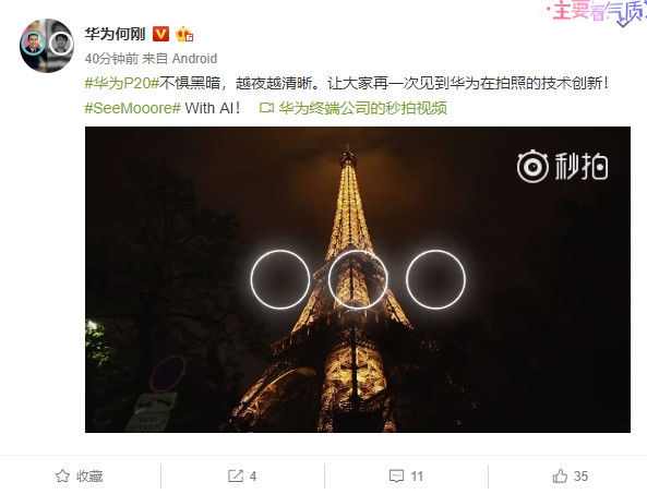 巴塞罗那MWC 2018大展期间,华为正式宣布新旗舰P20将于3月27日在法国巴黎发布。近日,华为官方频频放出新品越热消息。今日,华为官方又透露了新机的一项重磅升级——夜拍。3月1日上午,华为终端手机产品线总裁何刚发微博称:“#华为P20#不惧黑暗,越夜越清晰。让大家再一次见到华为在拍照的技术创新!#SeeMooore# With AI!”