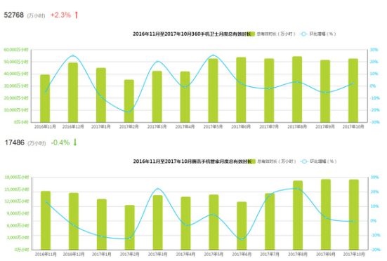 在月度总有效时长上,360手机卫士的优势也同样明显。数据显示,360手机卫士在10月的月度总有效时长为52768万小时,高居第一。这表明360手机卫士已经在用户规模、用户粘性等多方面实现了对市场的全面领跑。