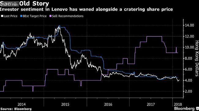 自2015年股价创下15年新高以来,联想市值已经蒸发了三分之二。2017年,联想把PC市场冠军宝座“拱手”让给惠普。过去2年,联想市盈率约为10倍,在全球最大PC厂商之中是最低的。根据一年来的回报,被彭博社认为最好的7名分析师,呼吁投资者卖出联想股票。他们给出的平均目标股价,比联想星期二的收盘价还要低13%。